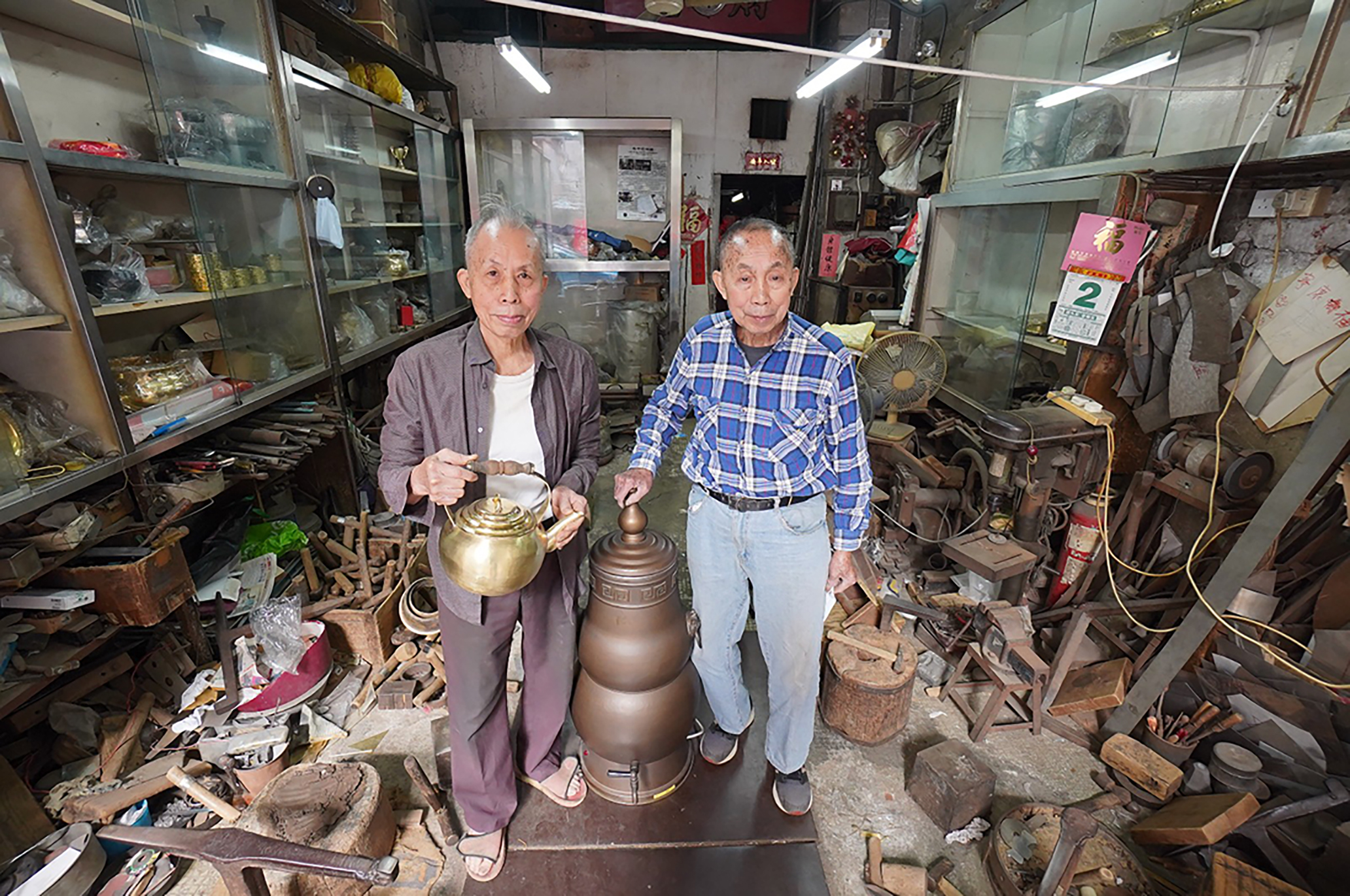 位於油麻地廚房用具店林立的咸美頓街,炳記銅器由父親陸炳於上世紀二十年代創立,及後由陸樹才和陸強才接手。兩兄弟十八歲入行跟隨爸爸學師,這樣一做便六十多年了⋯⋯那時這區還有不少打銅舖林立,對照現在炳記已是香港最後一間銅器舖,而似乎打銅這門工藝也敵不過時代的演變。