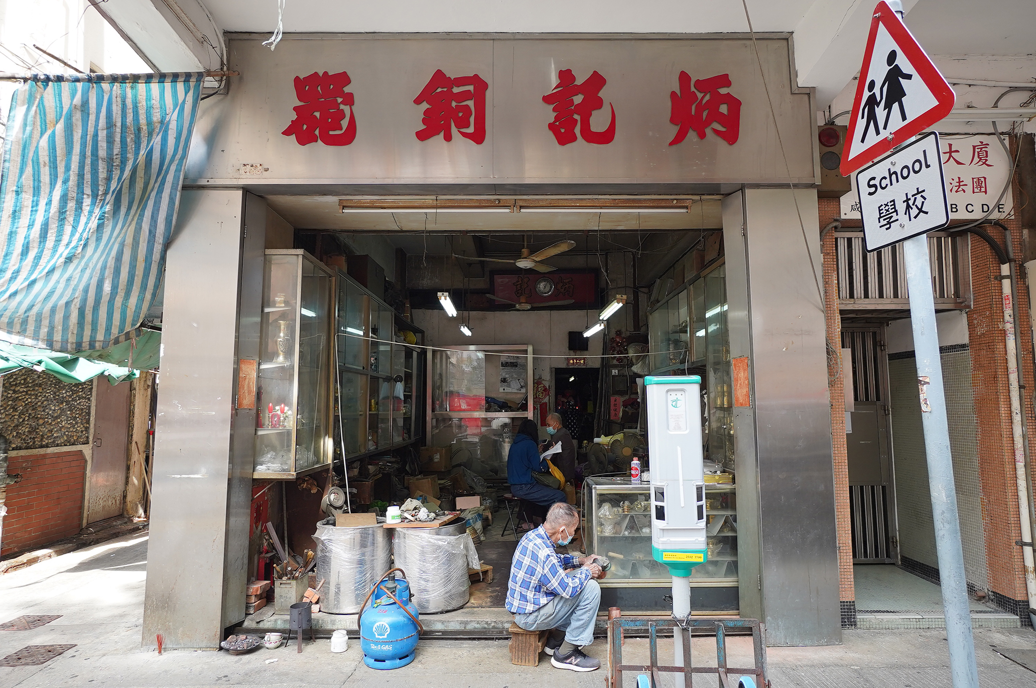 位於油麻地廚房用具店林立的咸美頓街,炳記銅器由父親陸炳於上世紀二十年代創立,及後由陸樹才和陸強才接手。兩兄弟十八歲入行跟隨爸爸學師,這樣一做便六十多年了⋯⋯那時這區還有不少打銅舖林立,對照現在炳記已是香港最後一間銅器舖,而似乎打銅這門工藝也敵不過時代的演變。