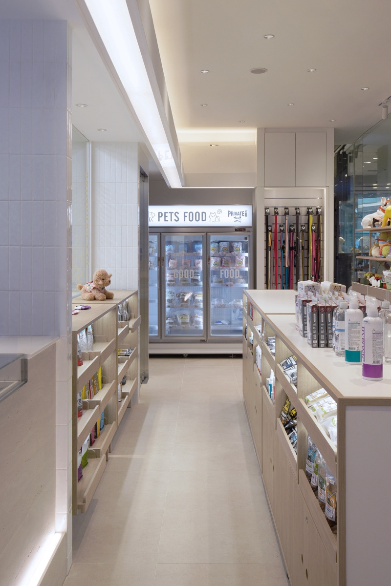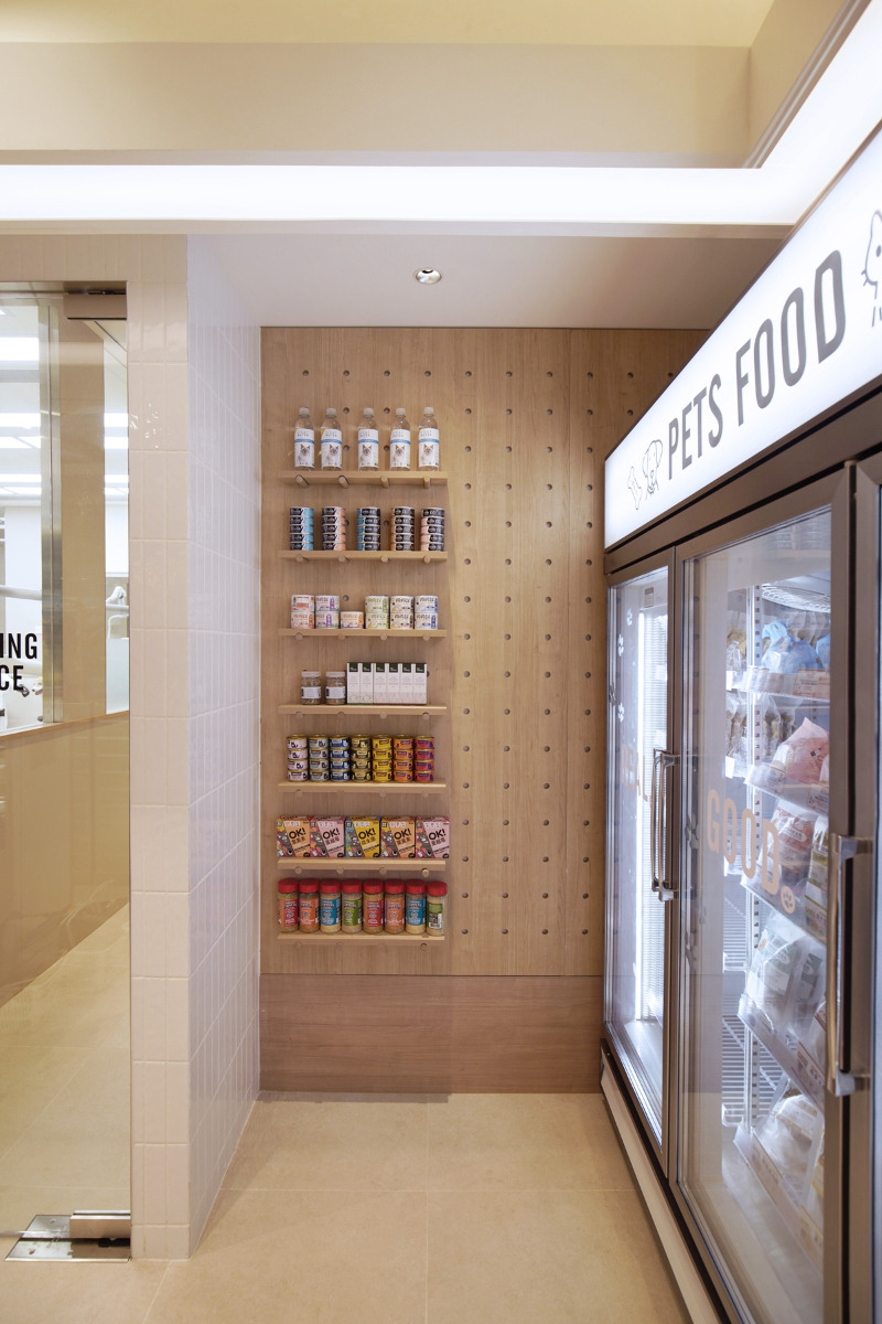 寵物美容室可說是店子的焦點之一,寵物主人可以透過玻璃窗,看到心愛毛孩享受SPA 的模樣,當主人和毛孩都樂在其中,便是我們設計的初衷了。貫徹店內的室內設計,寵物美容室亦用上淺色木材和簡潔的風格;而物料則以易於清潔為大前提,為的就是時刻保持空間整潔衛生。