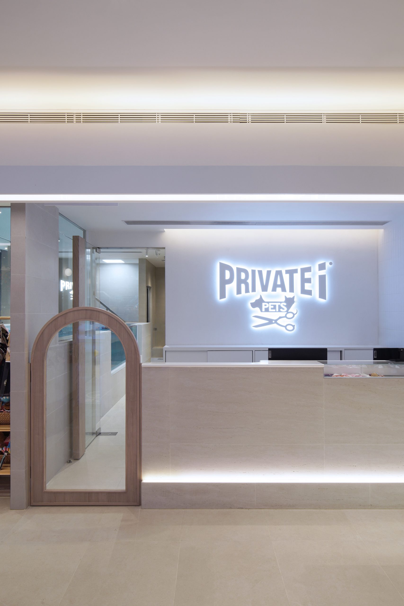 既是人寵共融的空間,我們希望為這裏帶來明亮的感覺,讓主人和毛孩都可感到溫暖、舒服。PRIVATE i PETS 的銅鑼灣分店以黑色為主軸,現代、冷酷的感覺與這裏截然不同。在又一城的分店我們用上淺色橡木為背景,細節處是我們以一度木屋簷連貫起寵物用品、接待處和寵物美容室三個部份,小木屋的設計為店子帶來趣味的同時,亦低調地散發着「同一屋簷下」的溫暖感覺。店裏明亮、溫暖,店外一目了然,在玻璃櫥窗當眼處還有一道透視 LED 屏幕,播放着小狗暢泳的愉快片段,讓主人從旁邊的商場玻璃門進來時,已可感受到店內的快樂氣氛。
